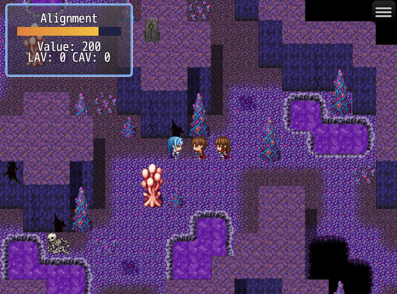By nature, I made it so you can use the variables to store the alignment. This way, you can also make events where you can check the value of the alignment and vary actions to the NPCs, enemies and maybe even cutscenes.